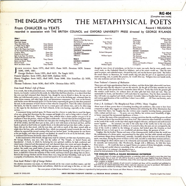 € 7.00 Media: Very Good Plus (VG+)John Donne, George Herbert, Francis Quarles, Henry Vaughan, Thomas Traherne – Tony Church, Richard Marquand, Peter Orr, William Squire – The Metaphysical Poets, Record I: Religious (LP)