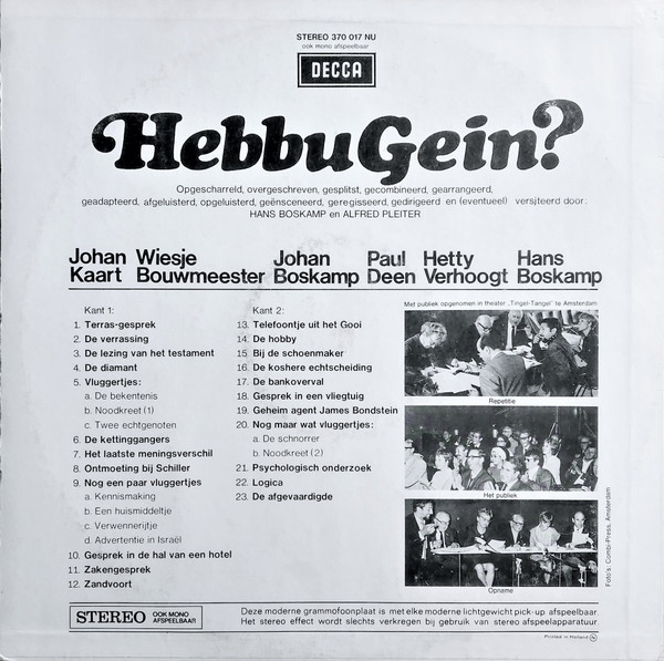€ 7.00 Media: Very Good Plus (VG+)Hoes: Very Good Plus (VG+)Johan Kaart, Wiesje Bouwmeester, Johan Boskamp, Paul Deen, Hetty Verhoogt, Hans Boskamp – Hans Boskamp En Alfred Pleiter Presenteren: Hebbu Gein? (LP, Album)