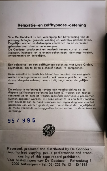 € 5.00 Media: Very Good Plus (VG+)Hoes: Very Good Plus (VG+)Ludo Gielen – Relaxatie En Zelfhypnose Oefening Met Ludo Gielen, Psycholoog (Cass, Album)