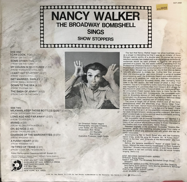 € 14.50 Media: Near Mint (NM or M-)Hoes: Very Good Plus (VG+)Nancy Walker – The Broadway Bombshell Sings Show Stoppers (LP, Album)