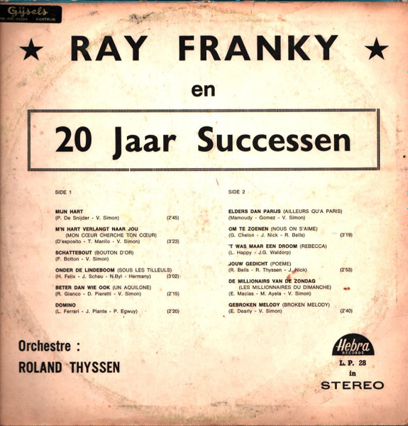 € 3.50 Media: Good Plus (G+)Hoes: Very Good Plus (VG+)Ray Franky – 20 Jaar Successen (LP, Comp)