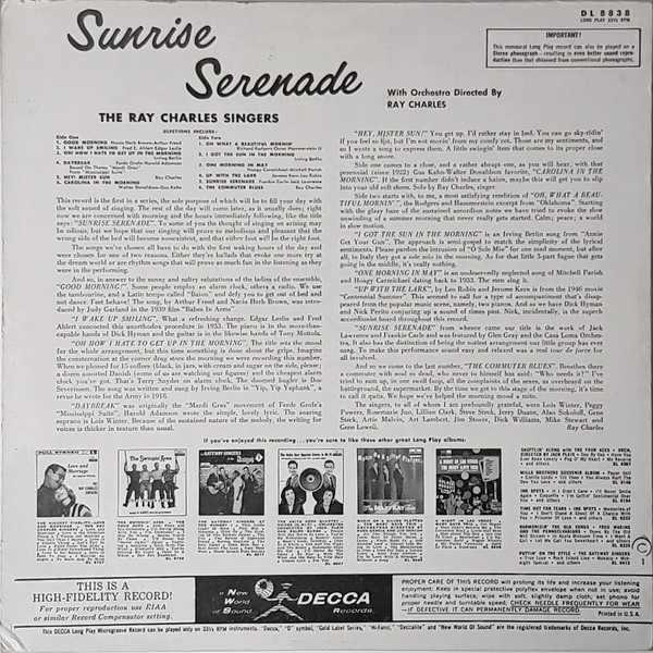 € 9.50 Media: Very Good Plus (VG+)Hoes: Very Good Plus (VG+)The Ray Charles Singers – Sunrise Serenade (LP, Album, Mono)