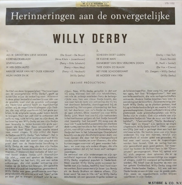 € 5.50 Media: Very Good (VG)Hoes: Good Plus (G+)Willy Derby – Herinneringen Aan De Onvergetelijke Willy Derby (LP, Comp)