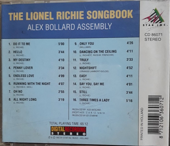 € 6.50 Media: Very Good Plus (VG+)Hoes: Very Good Plus (VG+)Alex Bollard Assembly – The Lionel Richie Songbook (CD, Album)