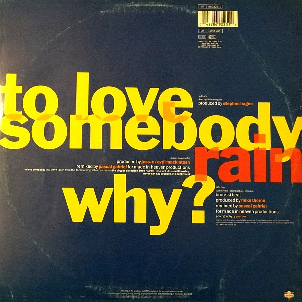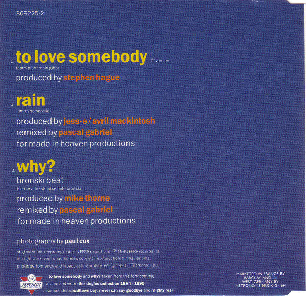 € 5.50 Media: Good (G)Hoes: Very Good (VG)Jimmy Somerville – To Love Somebody (12″, Single)