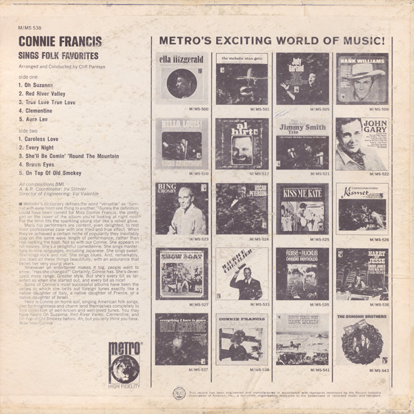 € 3.50 Media: Very Good (VG)Hoes: Good (G)Connie Francis – Sings Folk Favorites (LP, Album, Mono)