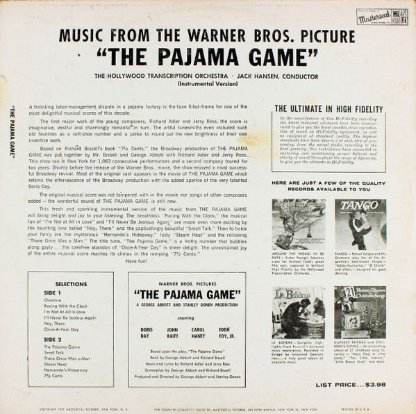 € 5.50 Media: Very Good (VG)Hoes: Very Good Plus (VG+)The Hollywood Transcription Orchestra – The Pajama Game – A Living Sound Recording Of Music From The Warner Brothers Motion Picture (Instrumental Version) (LP, Album)