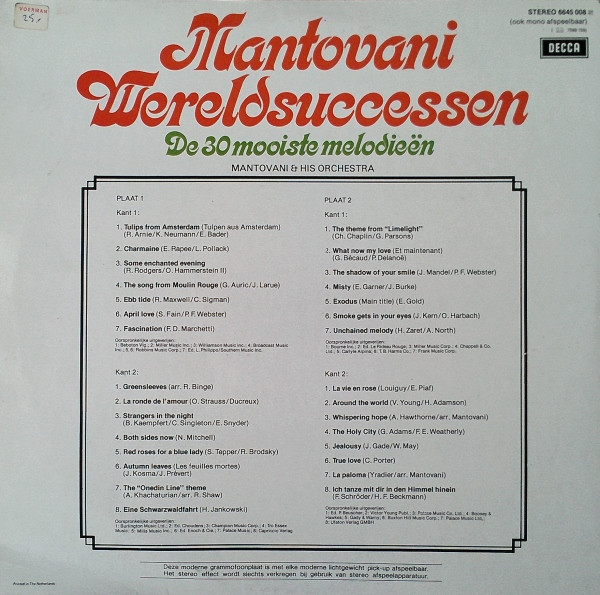 € 5.00 Media: Very Good Plus (VG+)Hoes: Very Good Plus (VG+)Mantovani – Wereldsuccessen – De 30 Mooiste Melodieën (2xLP, Comp, Gat)