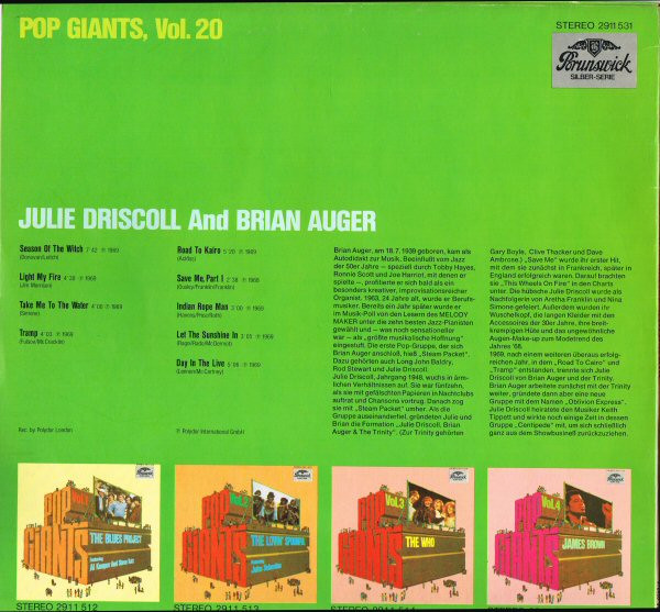 € 6.50 Media: Very Good Plus (VG+)Hoes: Very Good Plus (VG+)Julie Driscoll And Brian Auger – Pop Giants, Vol. 20 (LP, Comp, M/Print)