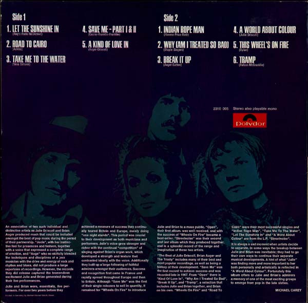€ 7.00 Media: Very Good Plus (VG+)Hoes: Very Good (VG)Julie Driscoll, Brian Auger & The Trinity – The Best Of Julie Driscoll, Brian Auger & The Trinity (LP, Comp)