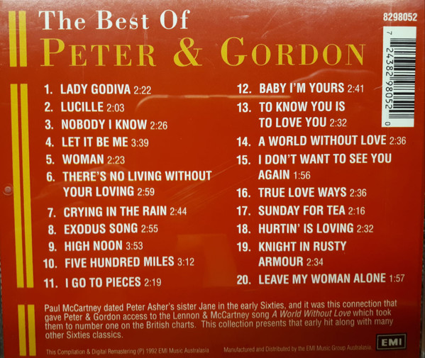 € 8.50 Media: Very Good (VG)Hoes: Very Good Plus (VG+)Peter & Gordon – The Best Of Peter & Gordon (CD, Comp, RM)