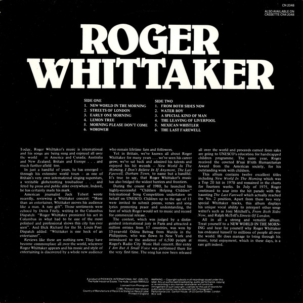 € 6.50 Media: Very Good Plus (VG+)Hoes: Very Good Plus (VG+)Roger Whittaker – New World In The Morning (LP, Comp)