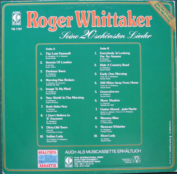 € 6.50 Media: Very Good Plus (VG+)Hoes: Very Good Plus (VG+)Roger Whittaker – Seine 20 Schönsten Lieder (LP, Comp)