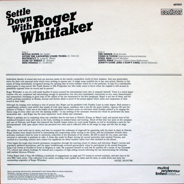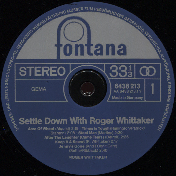 € 5.00 Media: Very Good Plus (VG+)Hoes: Very Good Plus (VG+)Roger Whittaker – Settle Down With Roger Whittaker (LP, Comp)