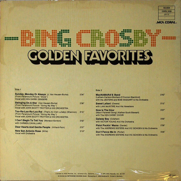 € 6.50 Media: Very Good (VG)Hoes: Very Good Plus (VG+)Bing Crosby – Golden Favorites (LP, Comp, RE)