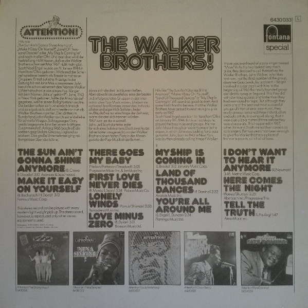 € 14.50 Media: Very Good Plus (VG+)Hoes: Very Good Plus (VG+)The Walker Brothers – Attention! The Walker Brothers! (LP, Comp)