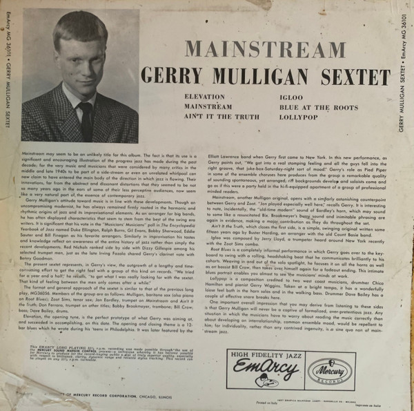 € 11.00 Media: Very Good (VG)Hoes: Very Good (VG)Gerry Mulligan And His Sextet – Mainstream Of Jazz (LP, Album, Mono)