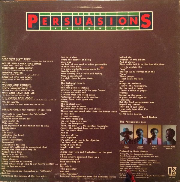 € 5.50 Media: Very Good (VG)The Persuasions – Chirpin’ (LP, Album, SP )