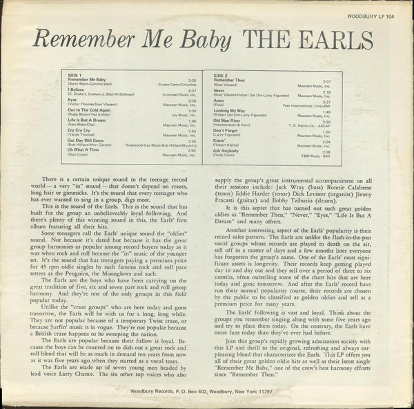 € 4.50 Media: Very Good Plus (VG+)The Earls – Remember Me Baby (LP, Comp, Mono, RE)