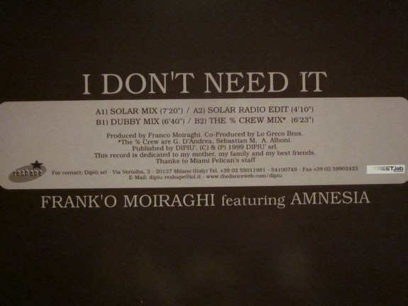 € 3.50 Media: Good Plus (G+)Hoes: Very Good (VG)Frank ‘O Moiraghi – I Don’t Need It (12″)