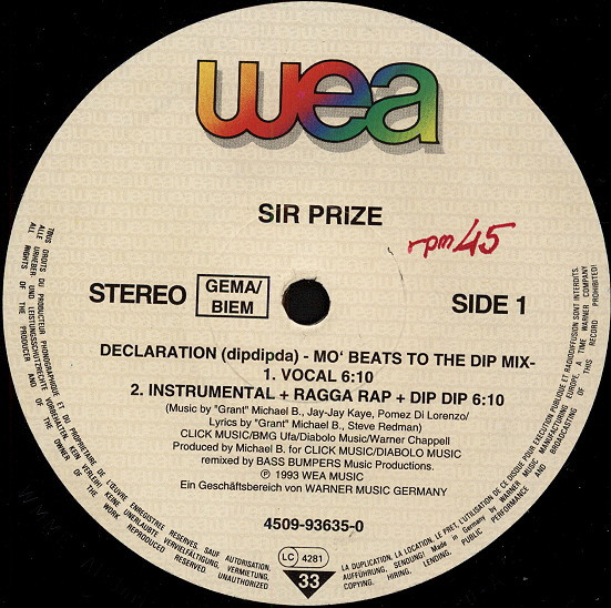 € 24.50 Media: Near Mint (NM or M-)Hoes: Near Mint (NM or M-)Sir Prize – Declaration (Dipdipda) – Mo’ Beats To The Dip Mix (12″)