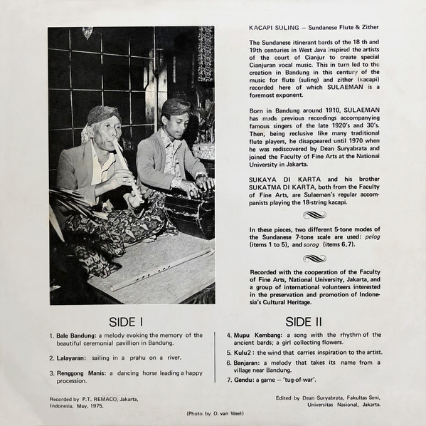 € 7.50 Media: Very Good Plus (VG+)Hoes: Very Good Plus (VG+)Sulaeman – Kacapi Suling (Sundanese Flute And Zither) (10″)