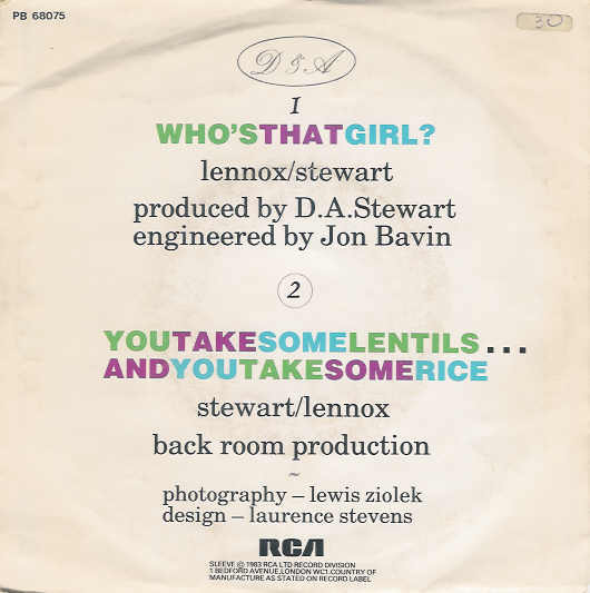 € 4.00 Media: Very Good Plus (VG+)Eurythmics – Who’s That Girl? (7″, Single)