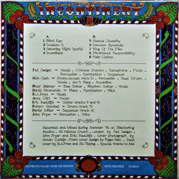 € 3.00 Media: Very Good (VG)Hoes: Very Good (VG)Fad Gadget – Incontinent (LP, Album, Tap)