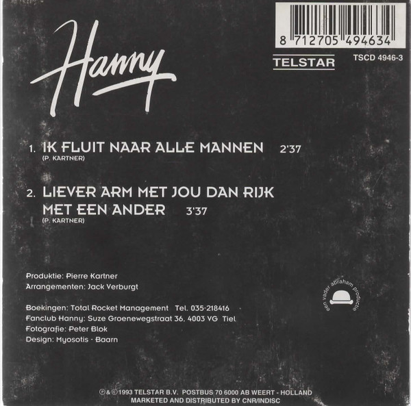 € 5.00 Media: Very Good Plus (VG+)Hoes: Very Good Plus (VG+)Hanny (2) – Ik Fluit Naar Alle Mannen (CD, Single, Car)
