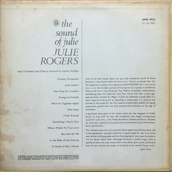 € 3.50 Media: Good (G)Hoes: Very Good Plus (VG+)Julie Rogers – The Sound Of Julie (LP, Album)