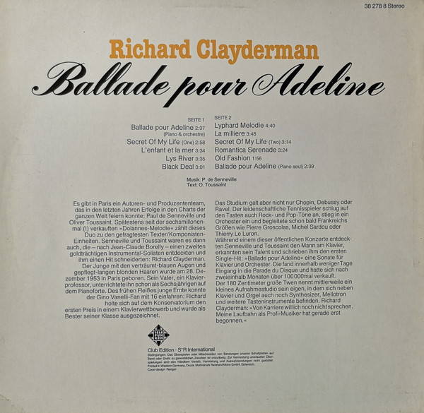€ 7.50 Media: Near Mint (NM or M-)Hoes: Very Good Plus (VG+)Richard Clayderman – Ballade Pour Adeline (CD, Comp)