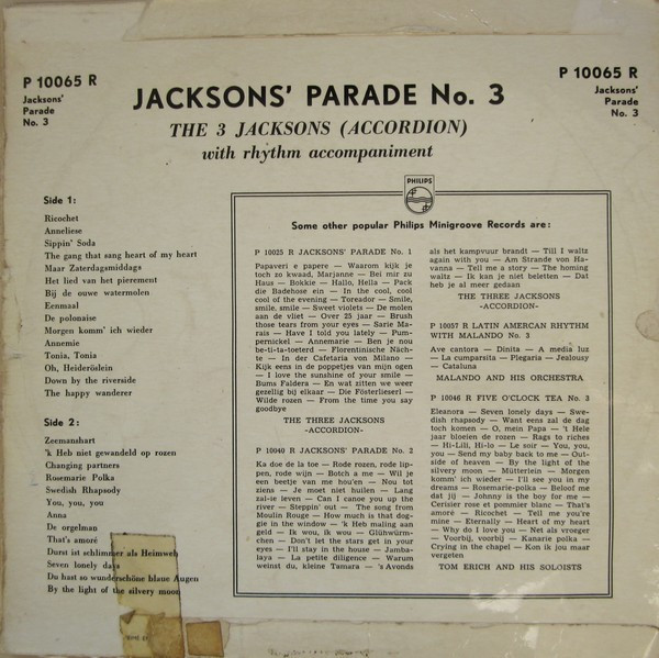 € 5.00 Media: Very Good (VG)Hoes: Very Good Plus (VG+)The 3 Jacksons – Jacksons’ Parade No. 3 (10″, Album)