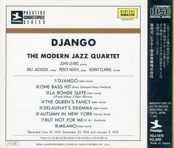 € 7.50 Media: Very Good Plus (VG+)Hoes: Very Good Plus (VG+)The Modern Jazz Quartet = The Modern Jazz Quartet – Django = ジァンゴ (CD, Album, Mono, RE, RM)
