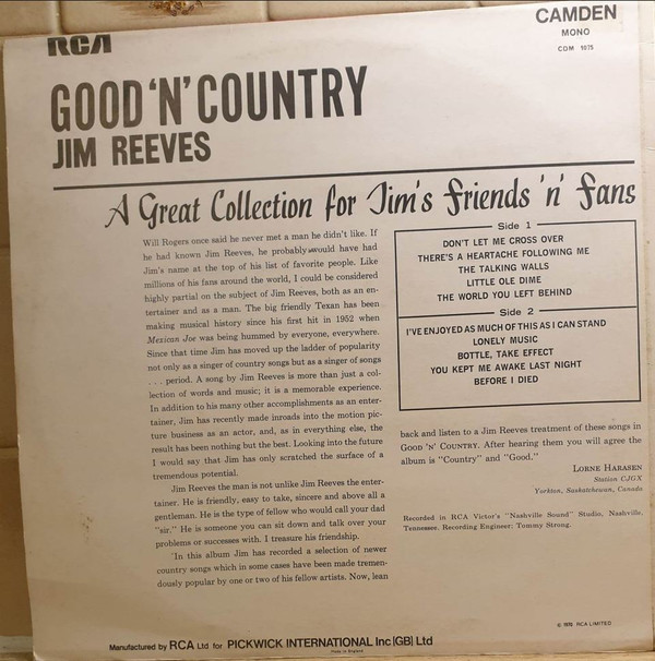 € 5.50 Media: Very Good (VG)Hoes: Very Good (VG)Jim Reeves – Good ‘N’ Country (LP, Album, Mono, RE)