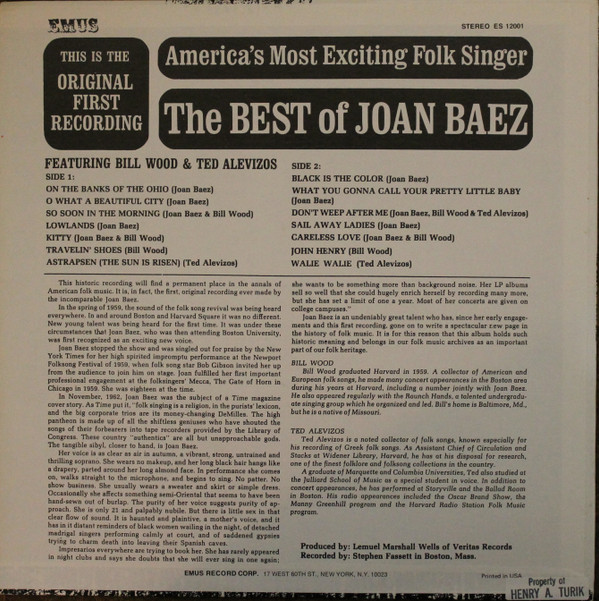 € 7.50 Media: Very Good (VG)Hoes: Very Good Plus (VG+)Joan Baez Featuring Bill Wood (5) & Ted Alevizos – The Best Of Joan Baez (LP, Album, RE)