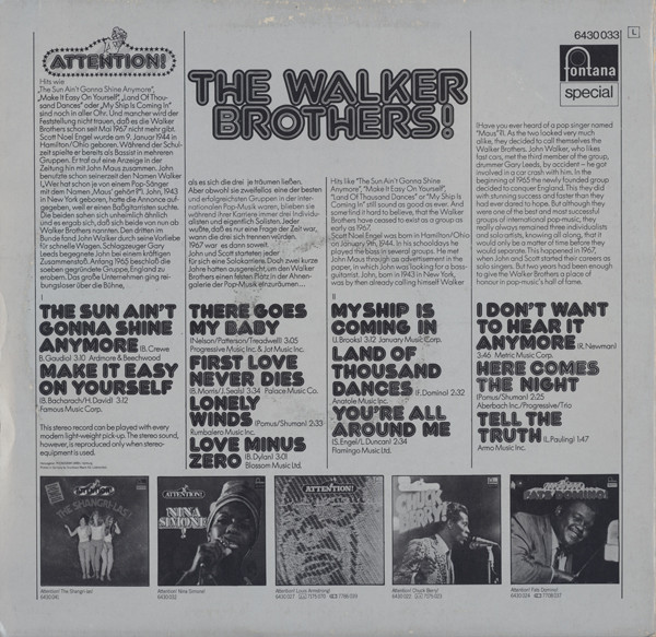 € 6.00 Media: Good Plus (G+)Hoes: Very Good Plus (VG+)The Walker Brothers – Attention! The Walker Brothers! (LP, Comp, RE)