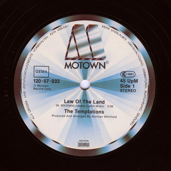 € 7.50 Media: Very Good Plus (VG+)Hoes: Very Good Plus (VG+)The Temptations – Law Of The Land / Plastic Man (12″, Maxi, RE)