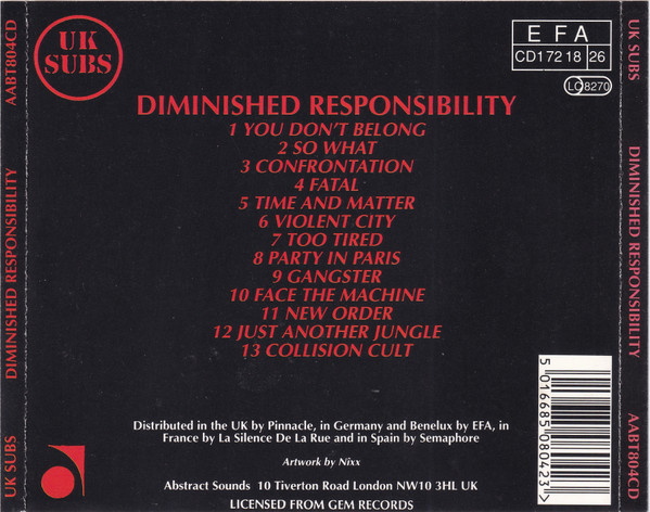 € 31.50 Media: Very Good (VG)Hoes: Very Good Plus (VG+)U.K. Subs* – Diminished Responsibility (CD, Album, RE)