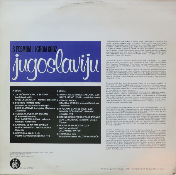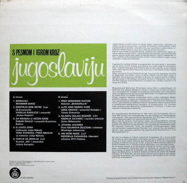€ 7.50 Media: Near Mint (NM or M-)Hoes: Very Good Plus (VG+)Various – S Pesmom I Igrom Kroz Jugoslaviju 1 (LP, Comp, RE)