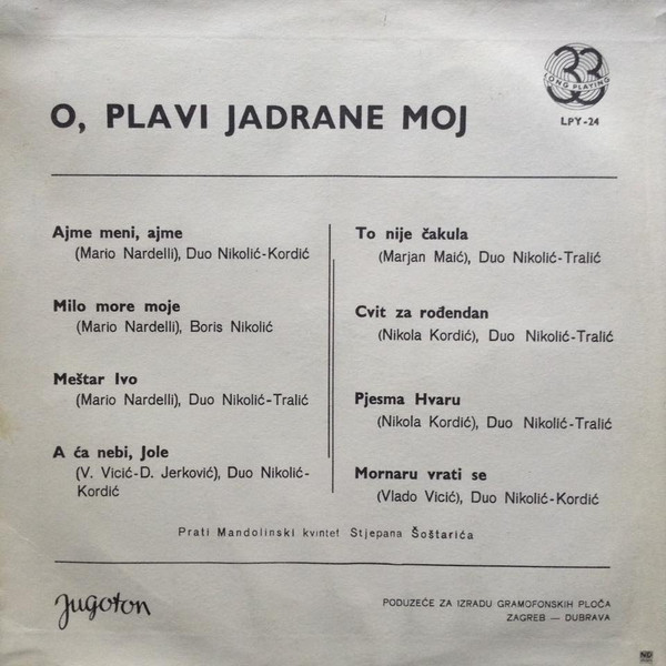 € 6.50 Media: Very Good Plus (VG+)Hoes: Very Good Plus (VG+)Various – O, Plavi Jadrane Moj (10″, Album, RE)