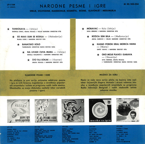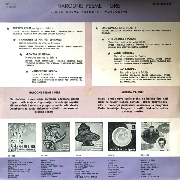 € 2.50 Media: Fair (F)Hoes: Very Good (VG)Various – Pesme I Igre Naroda Jugoslavije (Srbije, Bosne, Kosmeta I Vojvodine) (10″, Comp, RE, 5th)