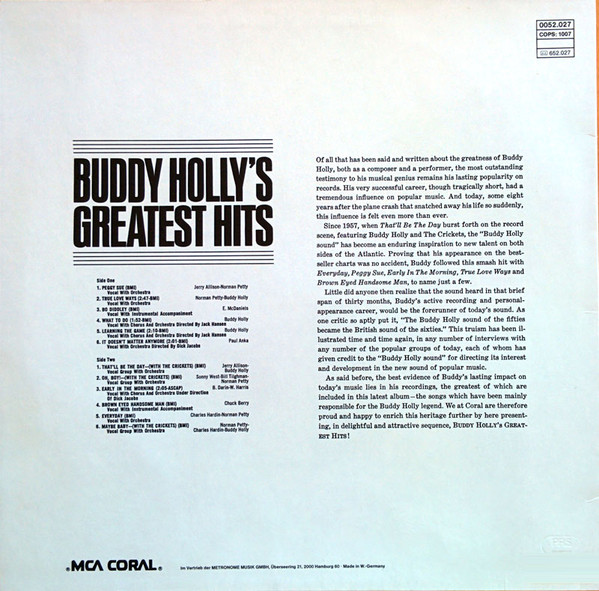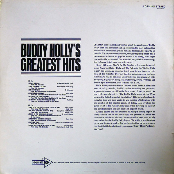 € 3.50 Media: Good Plus (G+)Hoes: Very Good Plus (VG+)Buddy Holly – Buddy Holly’s Greatest Hits (LP, Comp, RE)