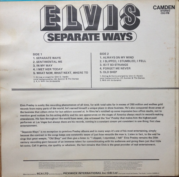 € 7.50 Media: Very Good (VG)Hoes: Very Good Plus (VG+)Elvis Presley – Separate Ways (LP, Album, RE)