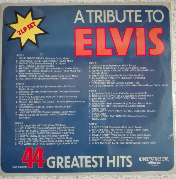 € 3.00 Media: Good (G)Hoes: Very Good (VG)Rupert (8) – A Tribute To Elvis, 44 Greatest Hits (3xLP)