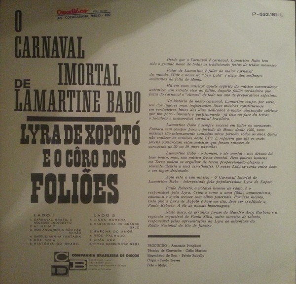 € 9.00 Media: Very Good Plus (VG+)Hoes: Very Good (VG)Lyra De Xopotó E O Coro De Folioes – O Carnaval Imortal De Lamartine Babo (LP, Album, Mono)
