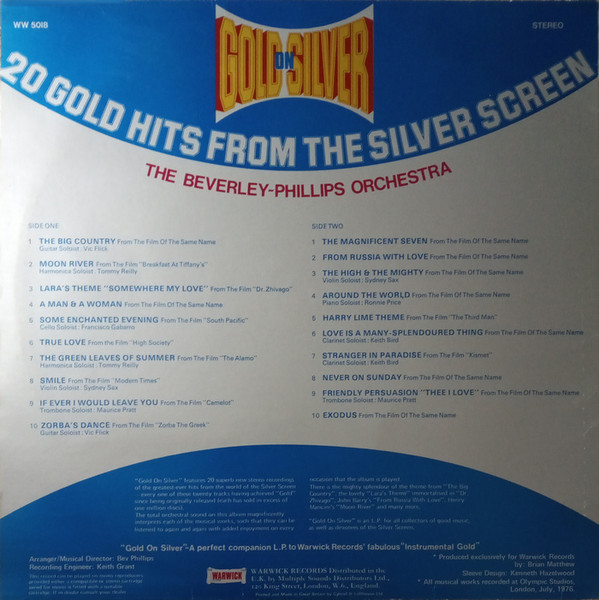 € 5.00 Media: Very Good (VG)Hoes: Very Good Plus (VG+)Bev Phillips Orchestra – Gold On Silver – 20 Gold Hits From The Silver Screen (LP, Comp)