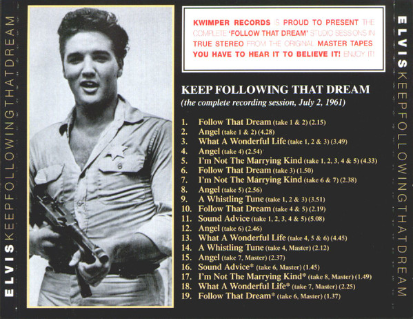 € 32.00 Media: Near Mint (NM or M-)Hoes: Very Good Plus (VG+)Elvis* – Keep Following That Dream (CD, Comp, Mono, Unofficial)
