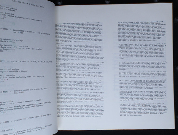 Antonio Mahaut, Johan Nicolaas Lentz, Willem de Fesch, Pieter Hellendaal, Johannes van Bree – Flute Concerto In E Minor / Harpsichord Concerto No. 1 In B Flat Major / Violin Concerto In A Minor Op. III/6 / Concerto Grosso In G Minor Op.3 No. 1 / Allegro For 4 String Quartets (LP, Mono, Ltd)