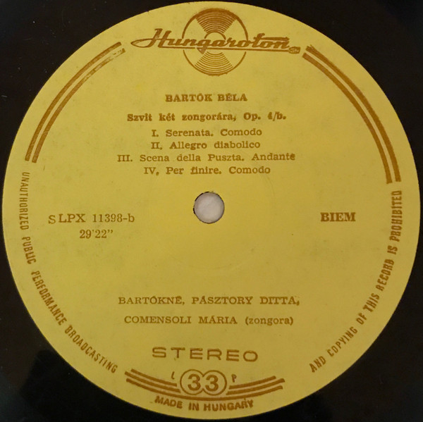 Béla Bartók – Ditta Pásztory-Bartók, Comensoli Mária, Tusa Erzsébet, Petz Ferenc, Marton József, Budapest Symphony Orchestra Conducted By Janos Sandor – Suite For Two Pianos, Op. 4 B / Concerto For Two Pianos, Percussion And Orchestra (LP, RP)