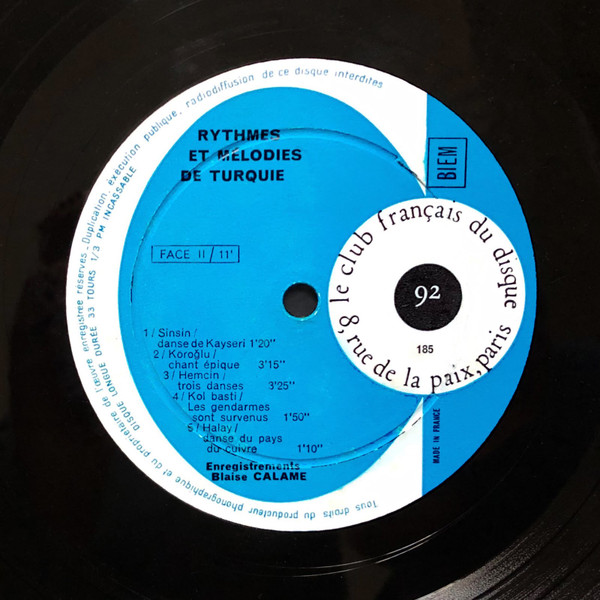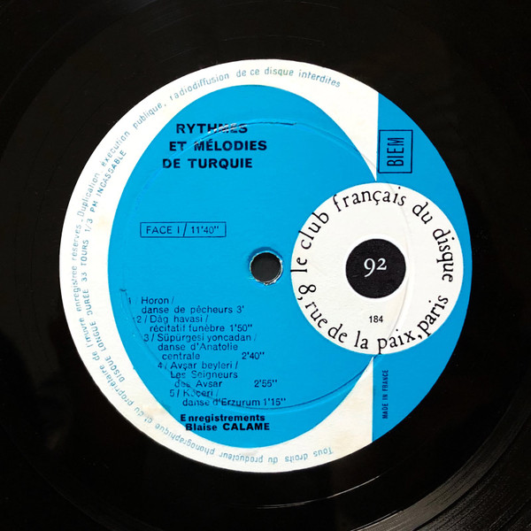 Blaise Calame / Unknown Artist – Rythmes Et Mélodies De Turquie (10″)